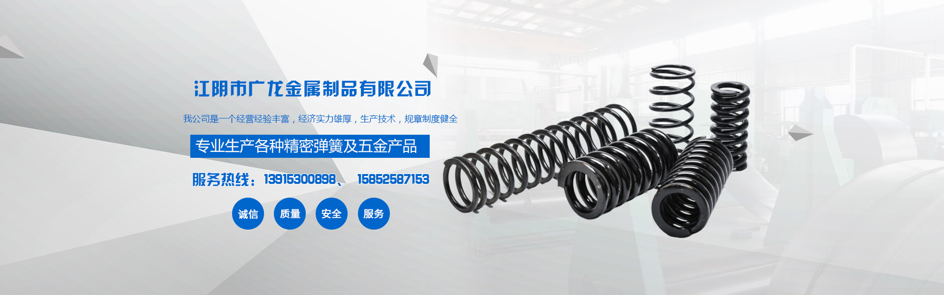 江陰市廣龍金屬制品有限公司,位于風(fēng)景美麗的江陰市。我公司是一個(gè)經(jīng)營經(jīng)驗(yàn)豐富,經(jīng)濟(jì)實(shí)力雄厚,生產(chǎn)技術(shù),規(guī)章制度健全,服務(wù)多元化,產(chǎn)品多元化,產(chǎn)品質(zhì)量高的金屬制品公司。主營產(chǎn)品:電動(dòng)工具彈簧、各類化妝品噴霧壓簧、各類異形彈簧、化妝品瓶蓋配重彈簧、精密儀器壓簧、卡簧、拉簧、扭簧、塔簧、油封彈簧、座椅掛鉤等彈簧兼容行業(yè)多的綜合性公司,如果您對我公司的產(chǎn)品服務(wù)感興趣,請?jiān)诰€留言或者來電咨詢,聯(lián)系電話:13915300898!